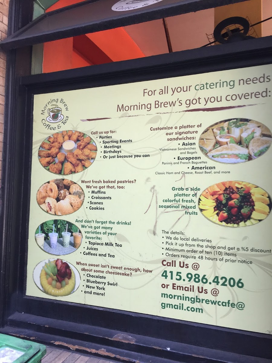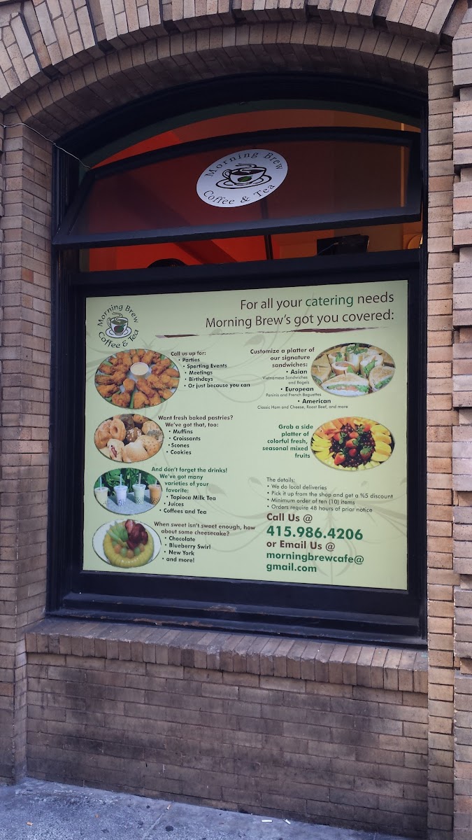 Located in San Francisco, Morning Brew Coffee & Tea offers a menu that combines classic cafe beverages with light meal options suitable for breakfast, coffee breaks, and casual dining. The menu includes a variety of coffee and tea drinks, highlighted by specialties such as iced Vietnamese coffee, alongside smoothies. Food options focus on sandwiches and Vietnamese-inspired dishes, including items like ham, egg, and cheese sandwiches, BBQ pork banh mi, and BBQ chicken vermicelli noodles.
